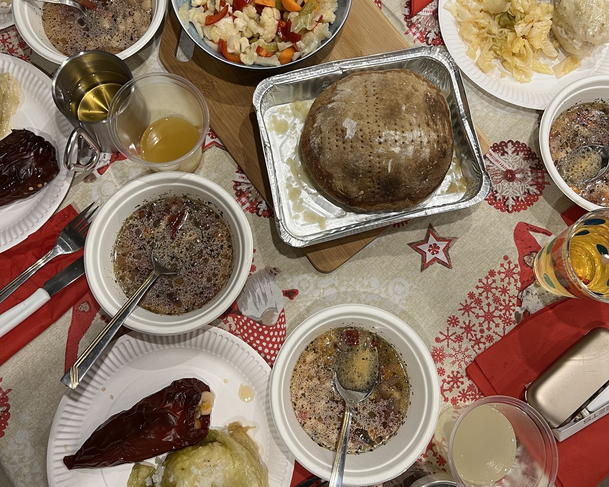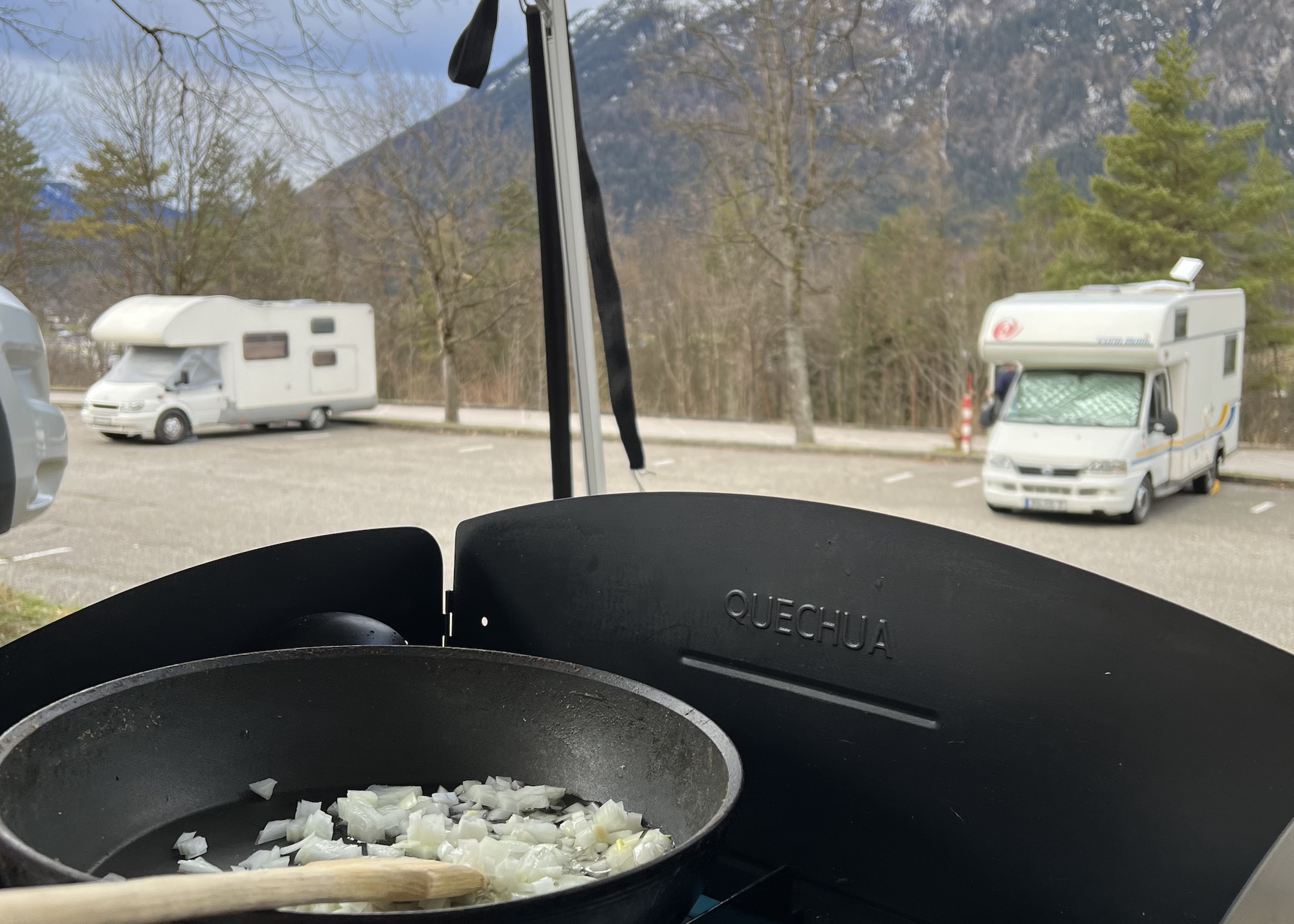 На кемп стопа от нас се носеше аромата на сарми, пълнени чушки, боб, българска туршия и питка с късмети. Това, че на Бъдни вечер се намирахме в подножието на Алпите, не ни попречи да си посрещнем празника с нашите си традиции. Едно от многото предимства на кемпер пътешествията е, че колкото и далеч да пътуваме, традициите винаги ни следват в багажника. Следващите часове минаха в кратка разходка и търсене на немска бира в затворения наблизо LIDL. Нищо не работеше по празниците, дори с вендинг машините не се справихме, защото не разпознаха нашите лични карти и в крайна сметка се примирихме, че с българските сарми ще пием български напитки. И Дядо Коледа ни беше български – нали знаете трите етапа на мъжете и Дядо Коледа?