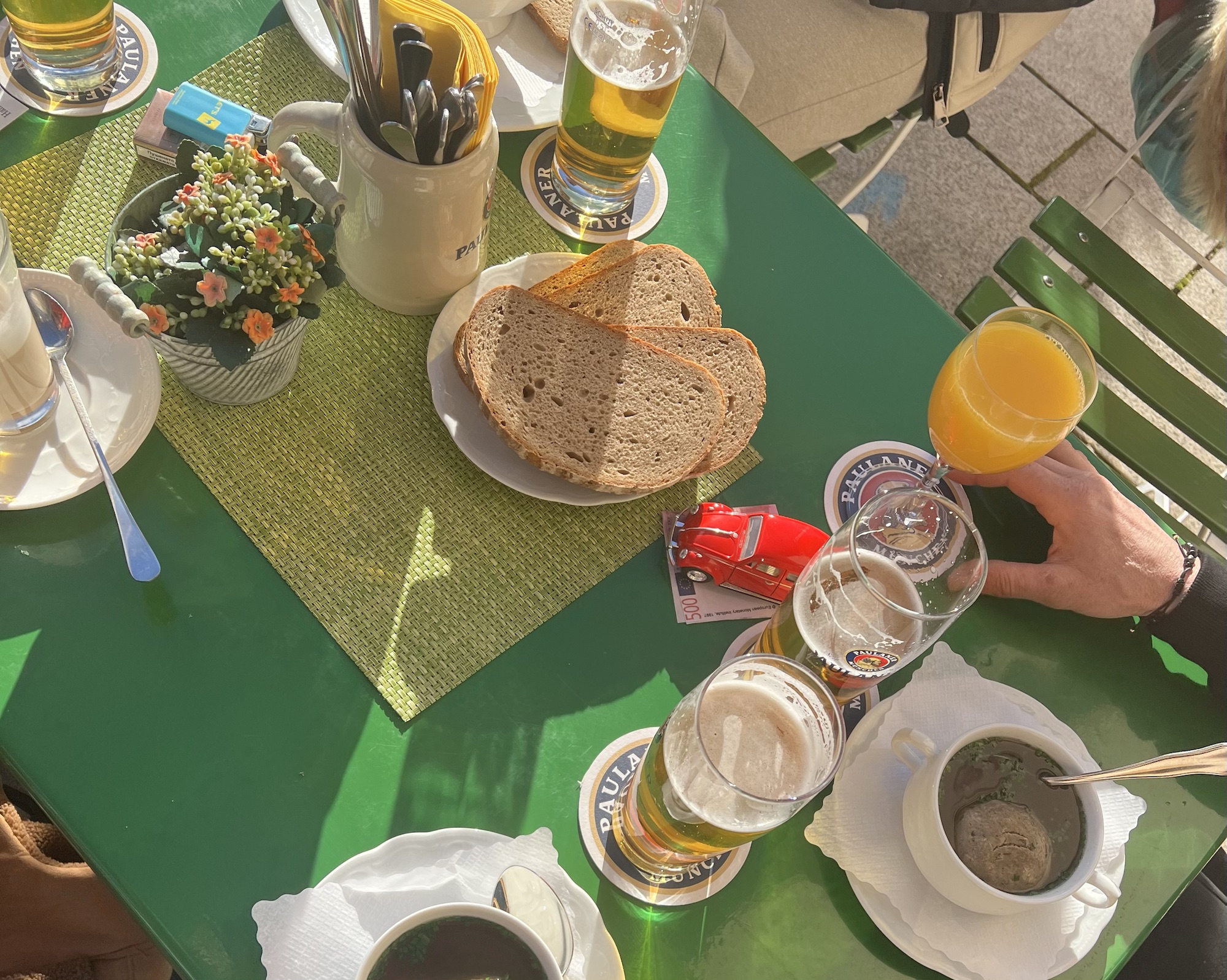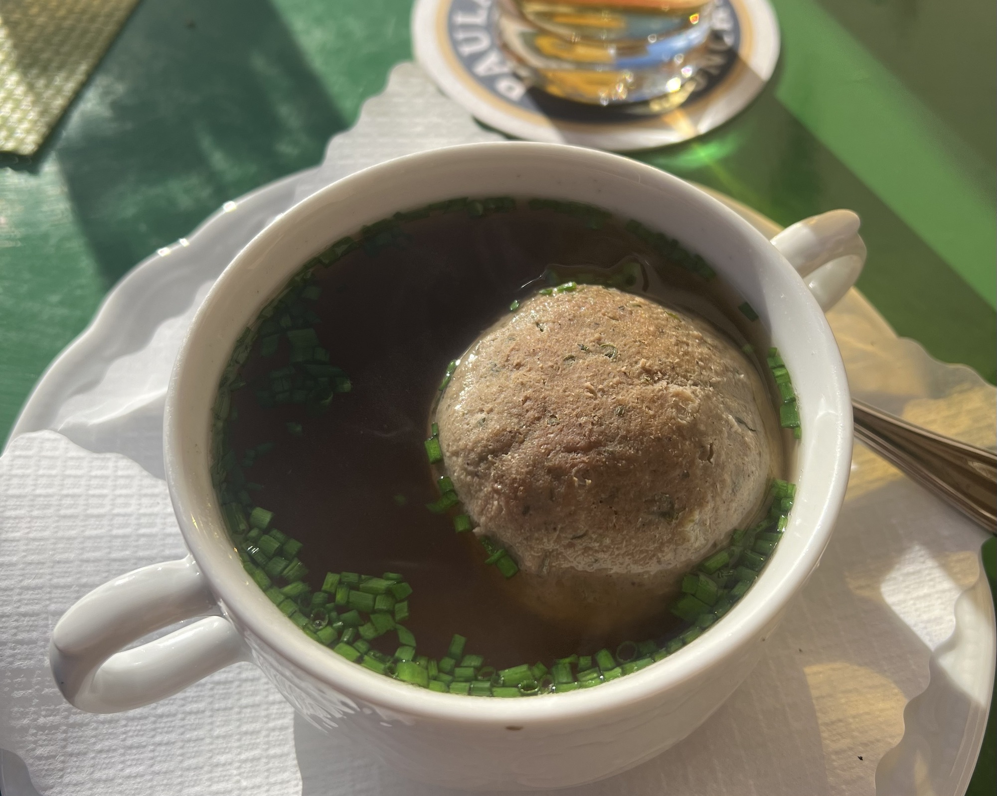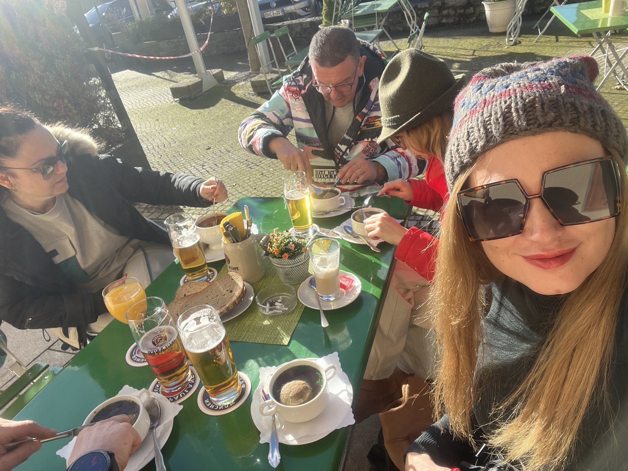 Поръчахме си Leberknodelsuppe – традиционна супа с кнедли от телешки дроб. Честно казано, само Сашо беше очарован, на мен ми се стори малко странна и различна от всичко, което съм опитвала до сега. В никакъв случай не беше лоша, но просто не беше по мой вкус, а Алекс я смени с Гулаш.